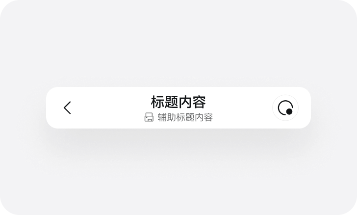 用于应用内页,左侧后退按钮,居中双行标题。标题通常用于提示当前页面内容,辅助标题提示状态等信息。