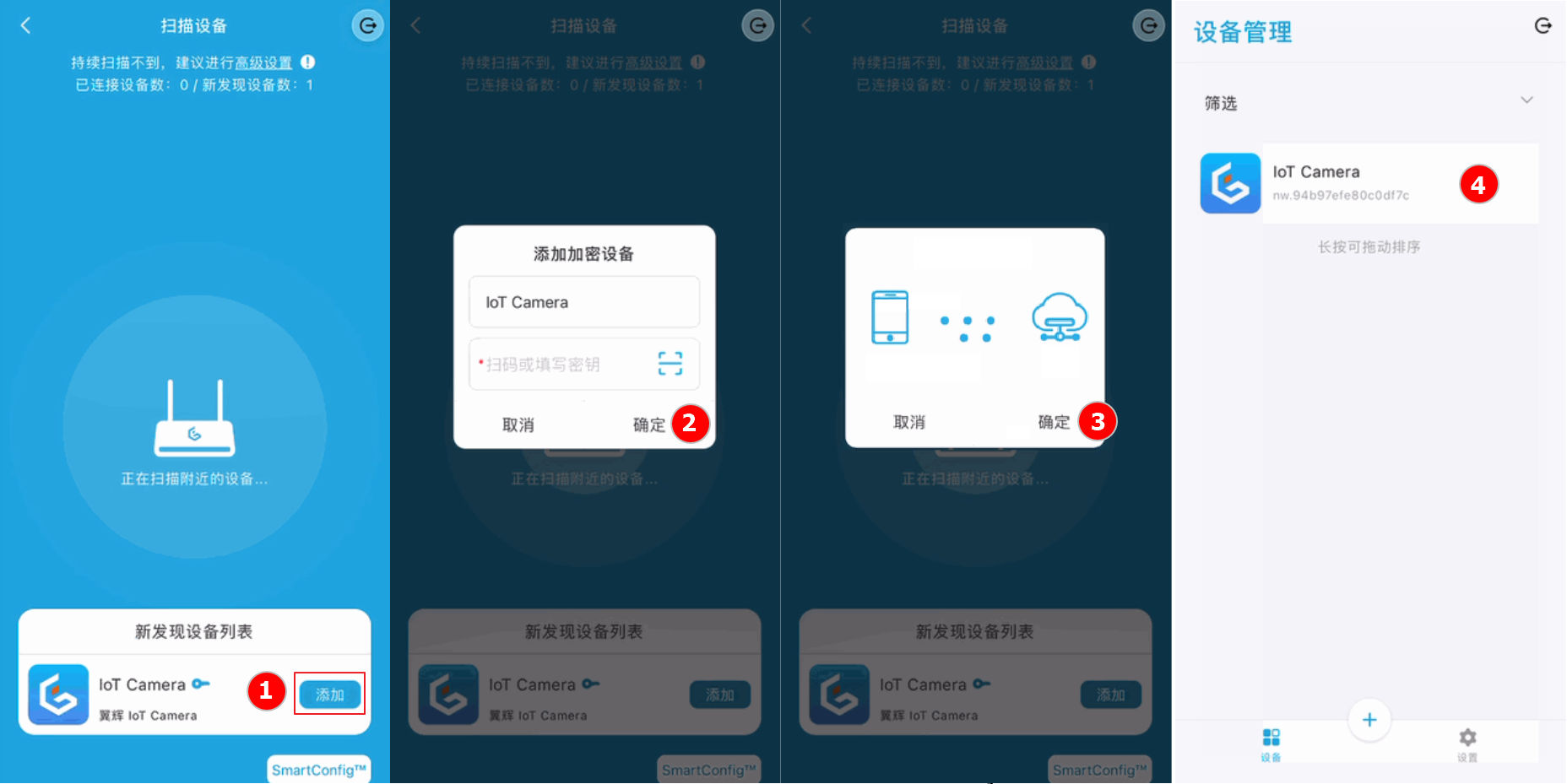 搜索到设备后点击添加,一些设备需要填写密码,添加完成后,在设备列表中可以查看新增的 IoT Camera 设备。