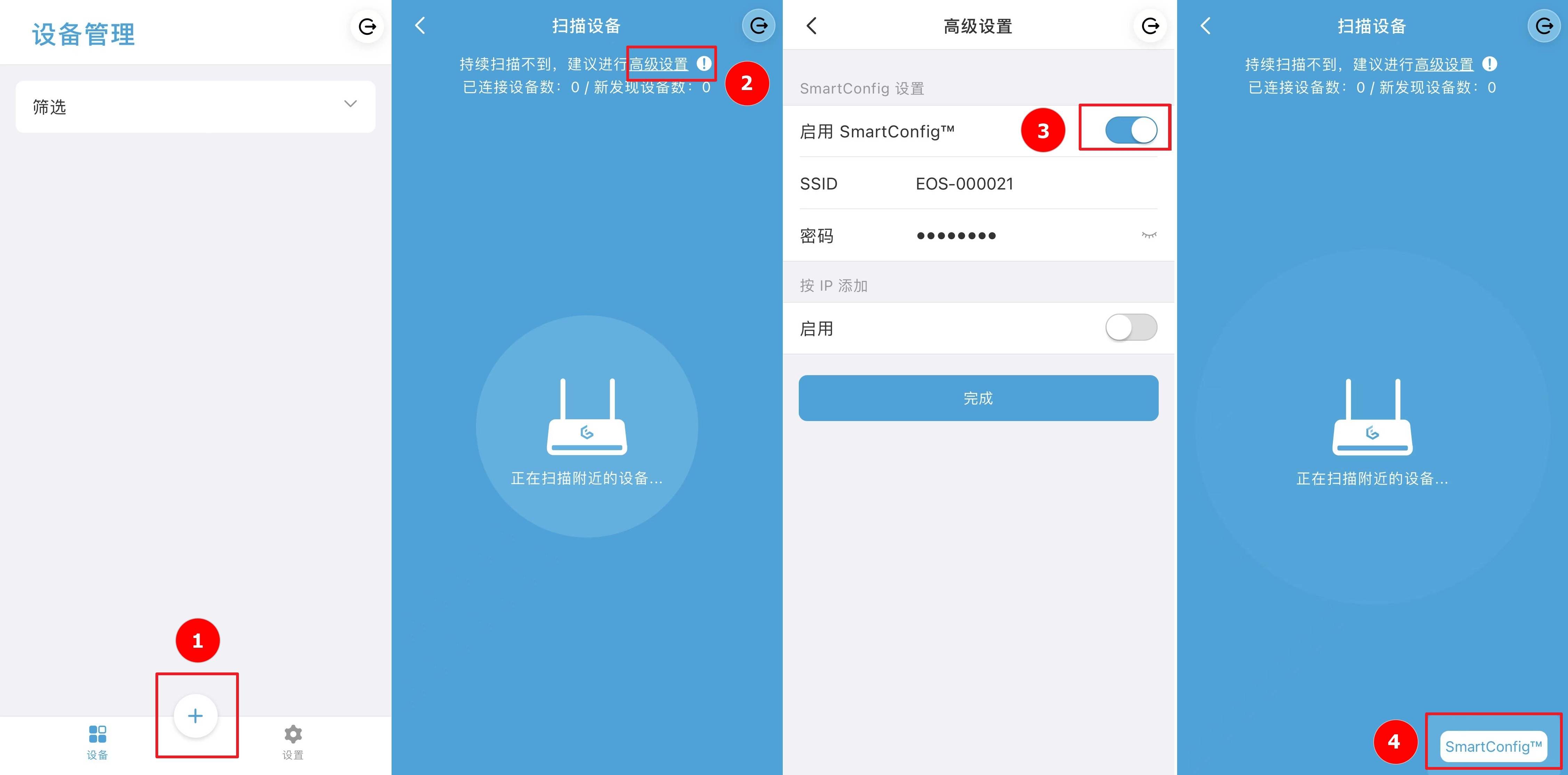 在爱智桌面点击设备,进入设备页面,点击 + 发现设备,进入扫描设备页面。
