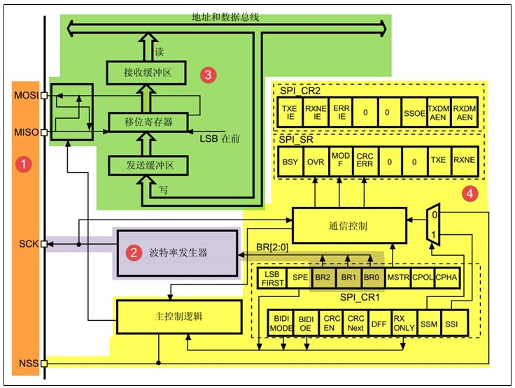 - SSn(Slave Select):从设备选择信号线,常称为片选信号线,也称为 NSS、CS,以下用 NSS 表示。SPI 通讯以 NSS 线置低电平为开始信号,以 NSS 线被拉高作为结束信号。