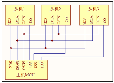 SPI 通讯使用 3 条总线及片选线,3 条总线分别为 SCK、MOSI、MISO,片选线为 SSn,它们的作用介绍如下: