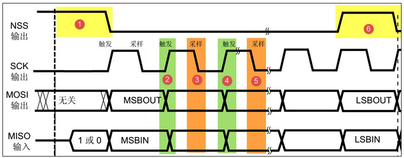 NSS、SCK、MOSI 信号都由主机控制产生,而 MISO 的信号由从机产生,主机通过该信号线读取从机的数据。MOSI 与 MISO 的信号只在 NSS 为低电平的时候才有效,在 SCK 的每个时钟周期 MOSI 和 MISO 传输一位数据。MOSI 及 MISO 的数据在 SCK 的上升沿期间变化输出,在 SCK 的下降沿时被采样。即在 SCK 的下降沿时刻,MOSI 及 MISO 的数据有效,高电平时表示数据 1,为低电平时表示数据 0。