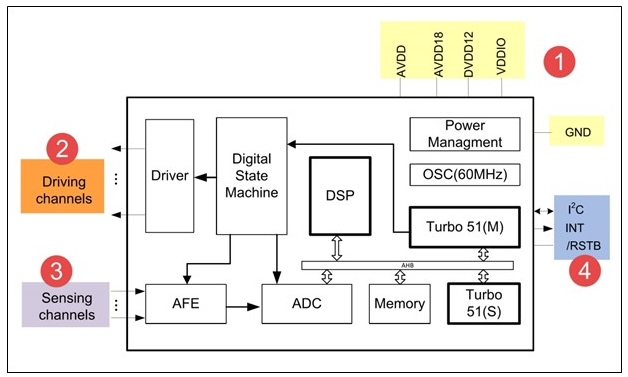 | Driving channels | 激励信号输出的引脚,一共有 0 - 25 个引脚,它连接到电容屏 ITO 层引出的各个激励信号轴 |