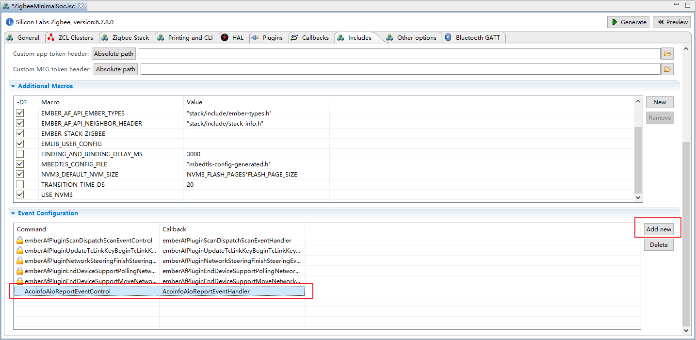 选择 Includes 选项,点击 Add new 添加一个自定义事件,用于定期上报模拟量通道 1,Command 为 AcoinfoAioReportEventControl ,Callback 为 AcoinfoAioReportEventHandler ,如下所示: