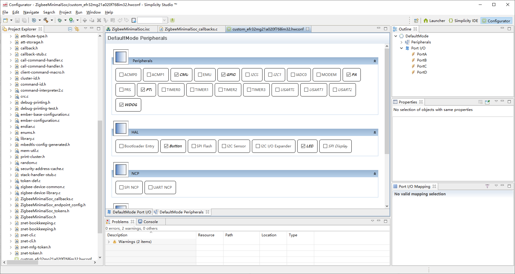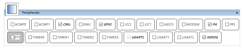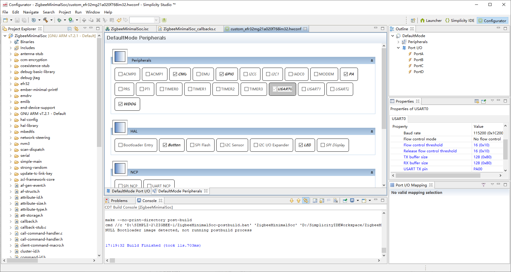 双击左侧 custom_efr32mg21a020f768im32.hwconf 文件后点击下方 DefaultMode Peripherals 选项来配置管脚: