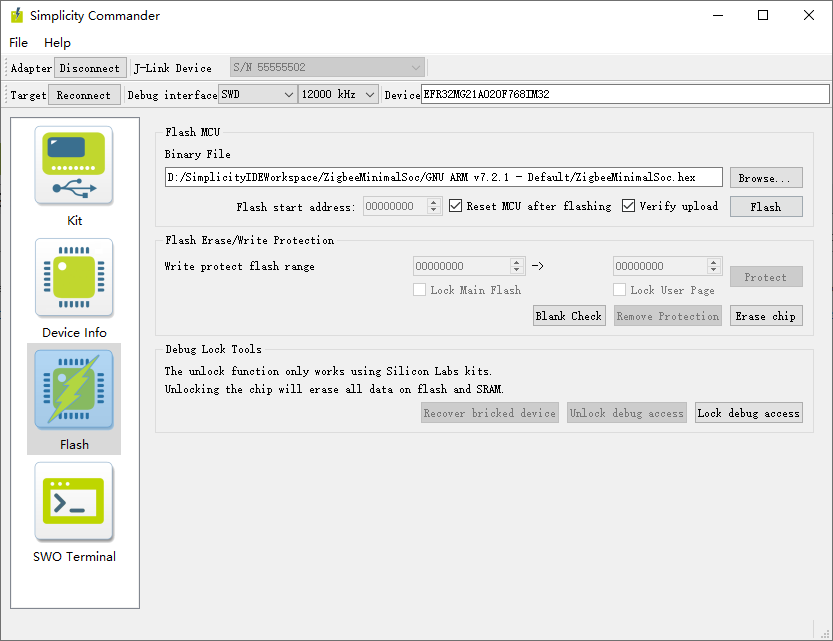 选择左侧第三个选项 Flash,然后依次点击上方 Adapter 和 Target 右边的 Connect 按键,点击 Browse 选择对应路径下的 Z3SwitchSoc.hex 文件,点击 Erase chip 擦除,点击 Flash 进行烧写,如下所示: