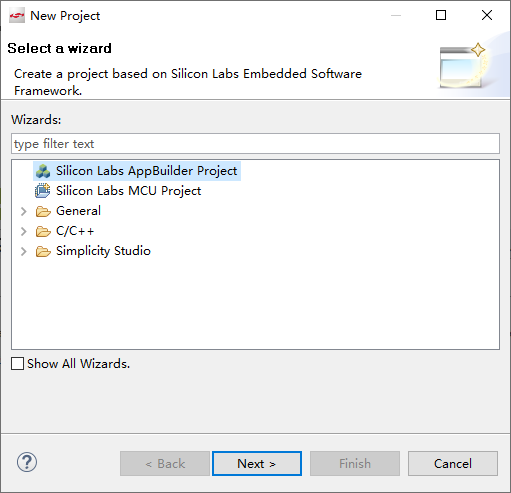 点击 File > New > Project ,选择 Silicon Labs AppBuilder Project ,点击 Next 如下所示: