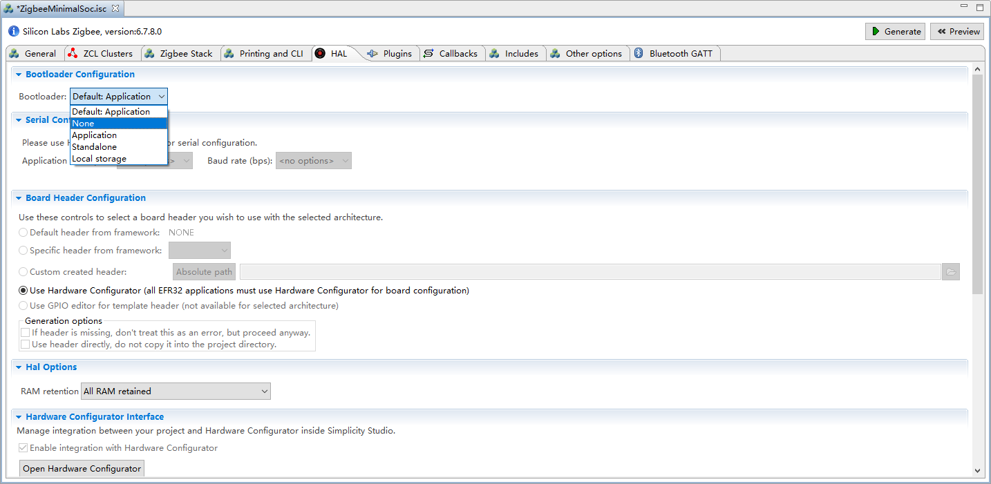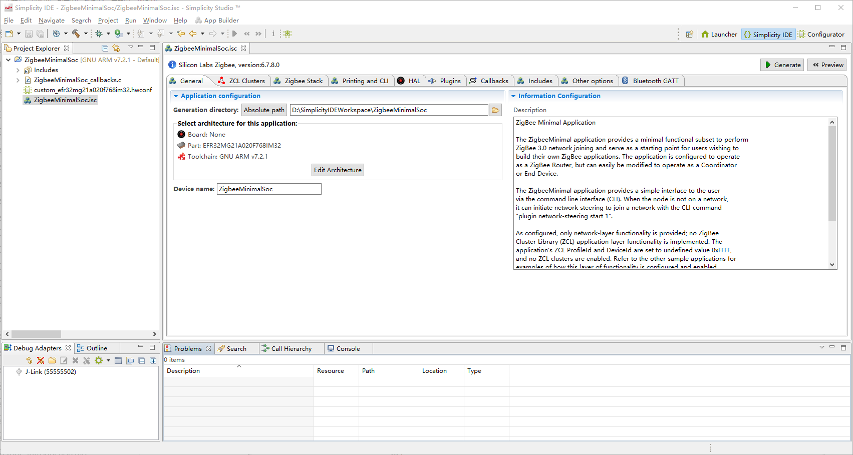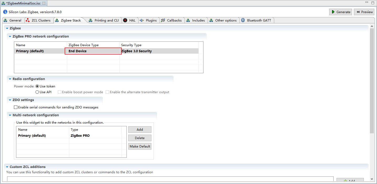 选择 ZigbeeMinimalSoc.isc 文件中的 Zigbee Stack 选项,选择 Zigbee Device Type 为 End Device 如下所示: