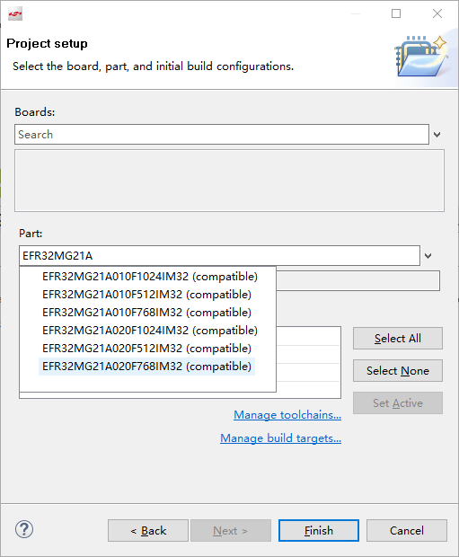 选择 Part 为 EFR32MG21A020F768IM32 后点击 Finish 如下所示: