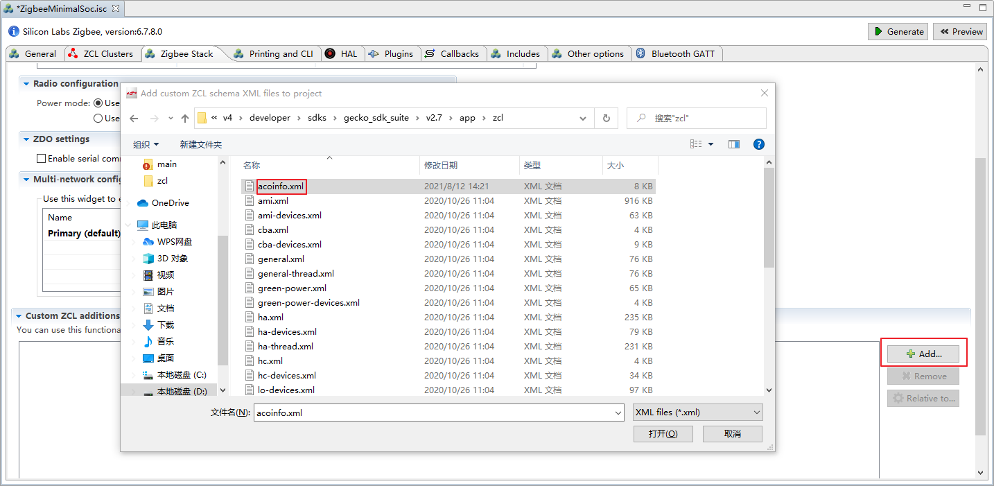 复制附录中的 acoinfo 自定义 Cluster 扩展规范文件 acoinfo.xml ,拷贝到 D:\v4\developer\sdks\gecko_sdk_suite\v2.7\app\zcl 目录下,Zigbee Stack 选项中点击 Add... ,添加 acoinfo.xml 到工程中,如下所示: