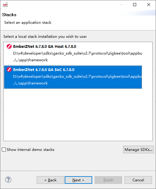 选择 EmberZNet 6.7.8.0 GA SoC 6.7.8.0 后点击 Next 如下所示: