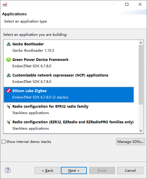 选择 Silicon Labs Zigbee 后点击 Next 如下所示:
