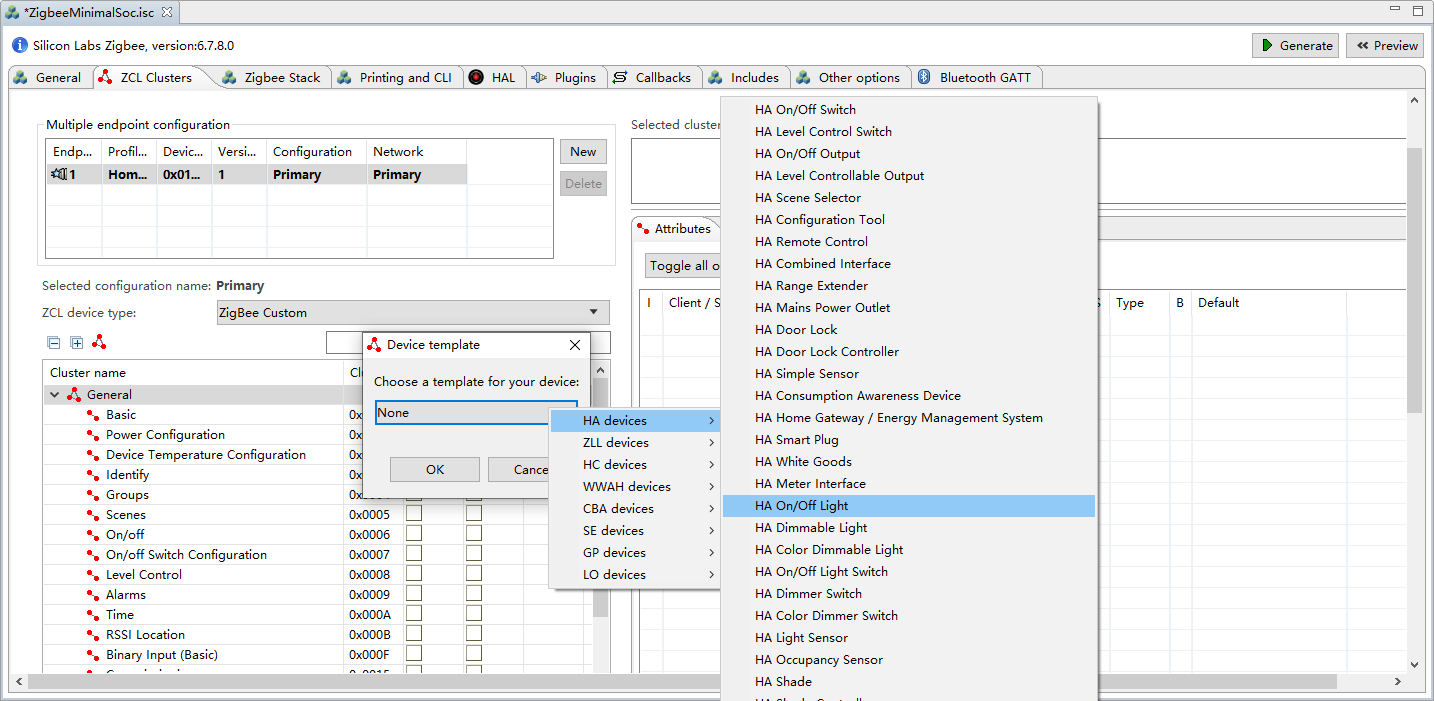 选择 ZCL Clusters 选项,按照下图所示选择 HA On/Off Light :