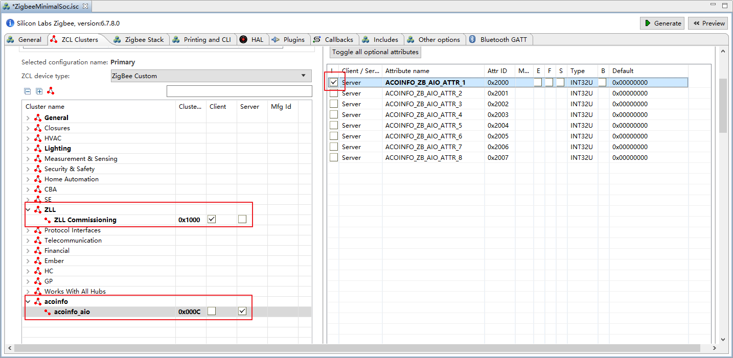 勾选 ZLL 中的 ZLL Commissioning ,以及 acoinfo 中的 acoinfo_aio 中的 AIO 通道 1,如下所示: