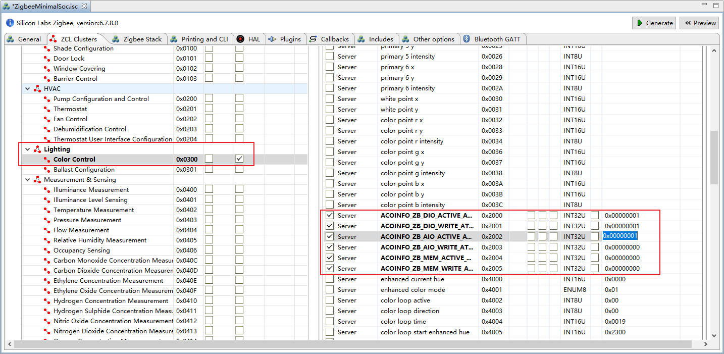 选择 Lighting 中的 Color Control ,在右侧选择 acoinfo 自定义的六个 attribute ,修改 DIO 通道可用和可写以及 AIO 通道的可用的默认值为 0x00000001,如下所示: