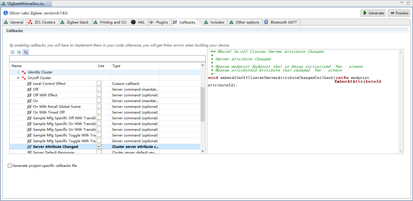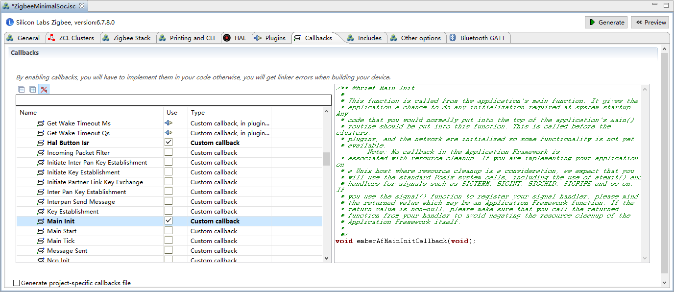 选择 Callbacks 选项,选中 Main Init 选项、Hal Button Isr 选项以及 Server Attribute Changed 选项,如下所示: