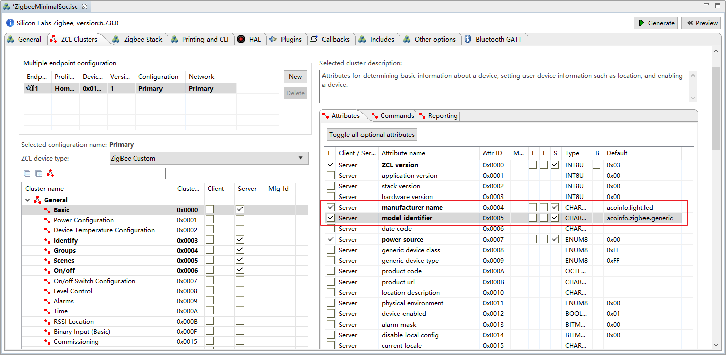 选择 ZCL Clusters 选项,点击下方 General 中的 Basic 在右侧添加 manufacturer name 为 acoinfo.light.led ,model id 为 acoinfo.zigbee.generic 如下所示: