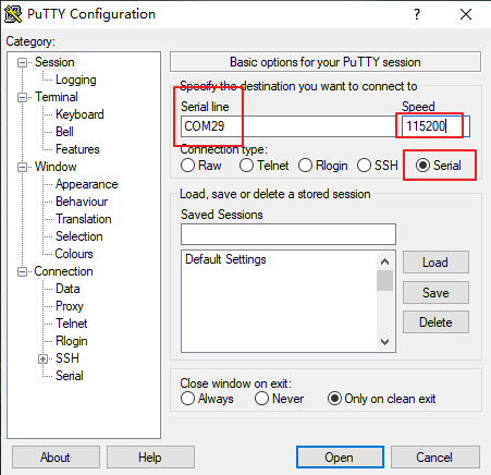 使用 PuTTY 作为串口调试工具,打开 PuTTY 进入 PuTTY Configuration 界面,选择 Session 类, Connection type 选择:Serial ,Serial line 为 EFR32 开发板接入 PC 后分配的 COM 号(如