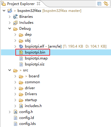 选中 bspstm32f4xx 工程,点击 "编译" 按钮,将编译 bspstm32f4xx 工程,编译完成后,会在 Debug 目录生成 bspiotpi.bin 文件: