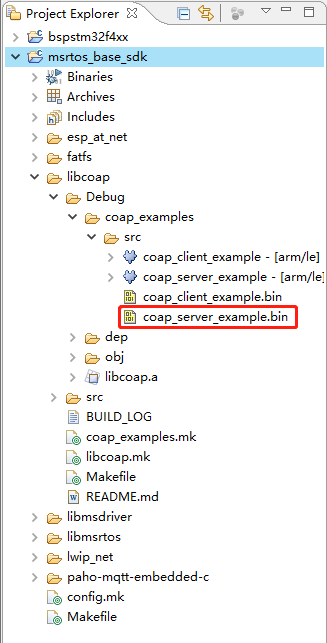 选中 msrtos_base_sdk 工程,点击 “编译” 按钮,将编译 msrtos_base_sdk 工程的组件,编译完成后,会在 libcoap/Debug/coap_examples/src 目录生成 coap_server_example.bin 文件: