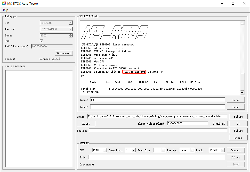 使用 MS-RTOS AutoTester 烧写镜像,请参考《IoT Pi 快速入门》完成 bspiotpi.bin 和 coap_server_example.bin 镜像烧写,注意不同的镜像需要烧写到不同的地址,如下表所示: