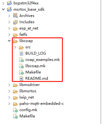 下载完成后右键 msrtos_base_sdk 工程选择 Refresh 菜单项刷新工程,刷新完成后将出现 libcoap 组件,如下图所示: