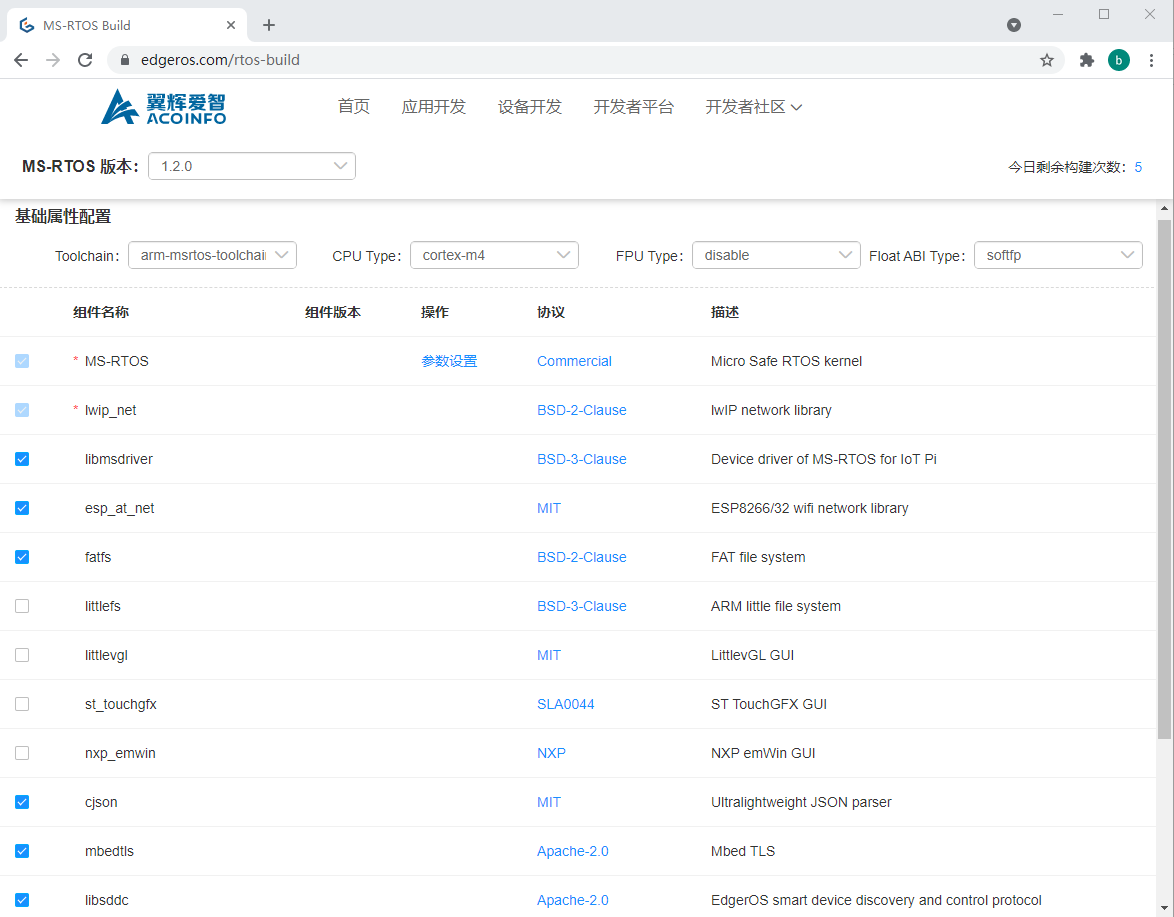 msrtos_base_sdk配置和下载, 配置 MS-RTOS 时,需要手动勾选 libmsdriver、esp_at_net、fatfs 这几个组件,如下图所示: