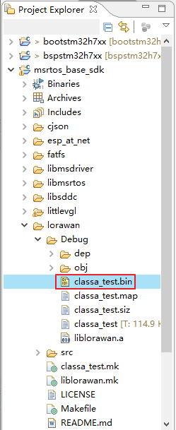 选中 msrtos_base_sdk 工程,点击编译按钮,将编译 msrtos_base_sdk 工程的组件,编译完成后,会在 lorawan/Debug 目录生成 classa_test.bin 文件,该文件就是 LoRaWAN CLASSA 模式的应用程序镜像,如下图所示: