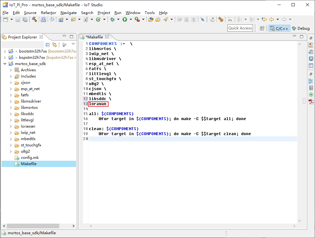 在 msrtos_base_sdk 根目录下的 Makefile 中添加 lorawan,如下图所示: