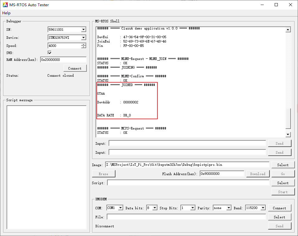 完成以上 3 个步骤后点击 MS-RTOS Auto Tester GO 按钮或对 IoT Pi Pro 进行复位,IoT Pi Pro 的 CPU 将开始运行,MS-RTOS 启动后,会自动运行 FLASH 0x90100000 地址处的 classa_test 应用程序,IoT Pi Pro 入网成功后会打印:JOINED 字样,同时会显示激活类型、设备地址和数据速率,如下图所示: