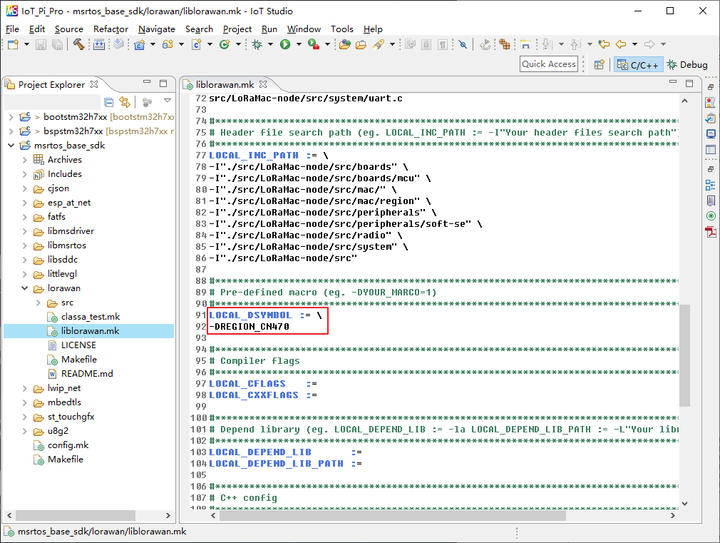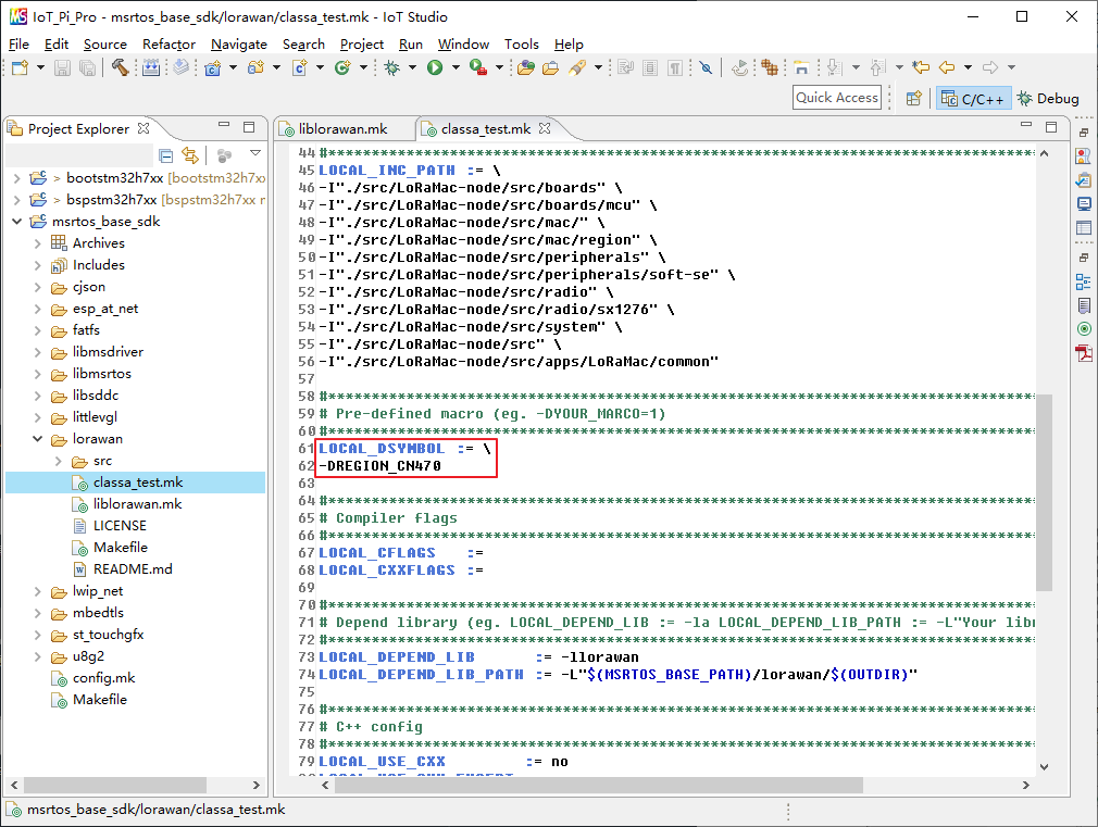 除了使用配置宏 ACTIVE_REGION 配置区域外,还需要分别在 msrtos_base_sdk\lorawan\iblorawan.mk 和 msrtos_base_sdk\lorawan\classa_test.mk 文件中添加预定义宏 REGION_CN470,如下图所示:
