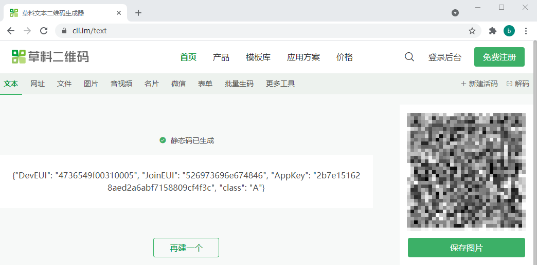 完成 LoRaWAN 设备二维码生成,需要使用程序中指定的入网参数生成的二维码,如下图所示: