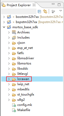 下载完成后右键 msrtos_base_sdk 工程选择 Refresh 菜单项刷新工程,刷新完成后将出现 lorawan 组件,如下图所示: