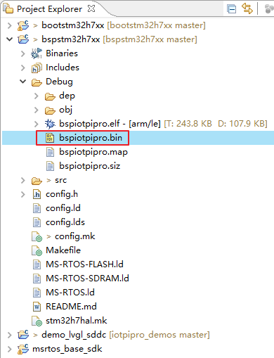选中 bspstm32h7xx 工程,点击编译按钮,将编译 bspstm32h7xx 工程,编译完成后,会在 Debug 目录生成 bspiotpi.bin 文件: