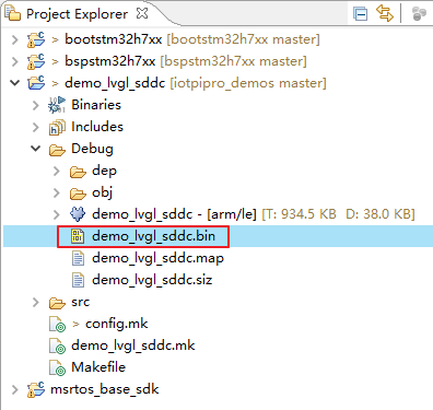 选中 demo_lvgl_sddc 工程,点击编译按钮,将编译 demo_lvgl_sddc 工程,编译完成后,会在 demo_lvgl_sddc/Debug 目录生成 demo_lvgl_sddc.bin 文件:
