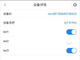 可以看到当前 LED 状态,并且 IoT Pi App、显示屏、LED 灯三者状态是同步的。可以通过 IoT Pi App、IoT Pi Pro 的三个按键以及显示屏上的开关控制 LED 灯。