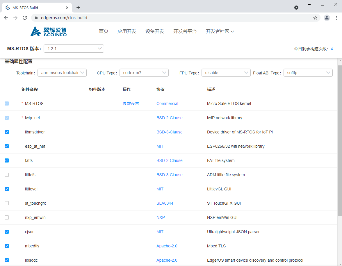 msrtos_base_sdk配置和下载,配置 MS-RTOS 时,需要手动勾选 libmsdriver、esp_at_net、fatfs、littlevgl、cjson、mbedtls、 libsddc 这几个组件,如下图所示: