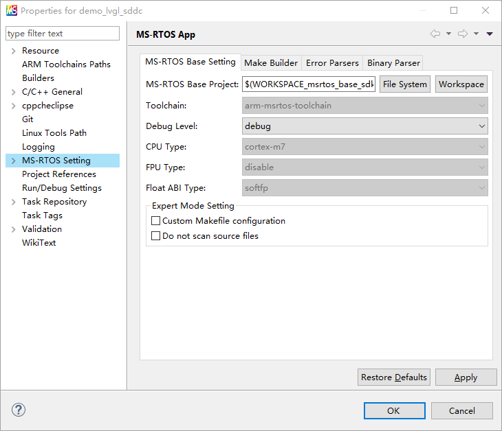选中 demo_lvgl_sddc 工程,点击鼠标右键,点击弹出的快捷菜单中的 Poperties 菜单项,将弹出 demo_lvgl_sddc 工程属性配置对话框,选择 MS-RTOS Setting 类,选择工作空间下的 msrtos_base_sdk 工程为 MS-RTOS Base Project,同时将 Debug Level 修改为 debug,最后点击 OK 按钮: