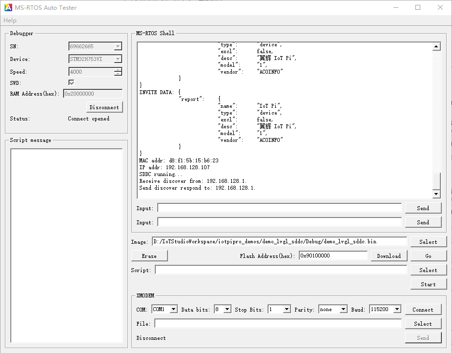 使用 MS-RTOS AutoTester 烧写镜像,请参考《IoT Pi Pro 快速入门》完成 bootstm32h7xx.bin 和 bspiotpipro.bin 及 demo_lvgl_sddc.bin 镜像烧写,注意不同的镜像需要烧写到不同的地址,如下表所示: