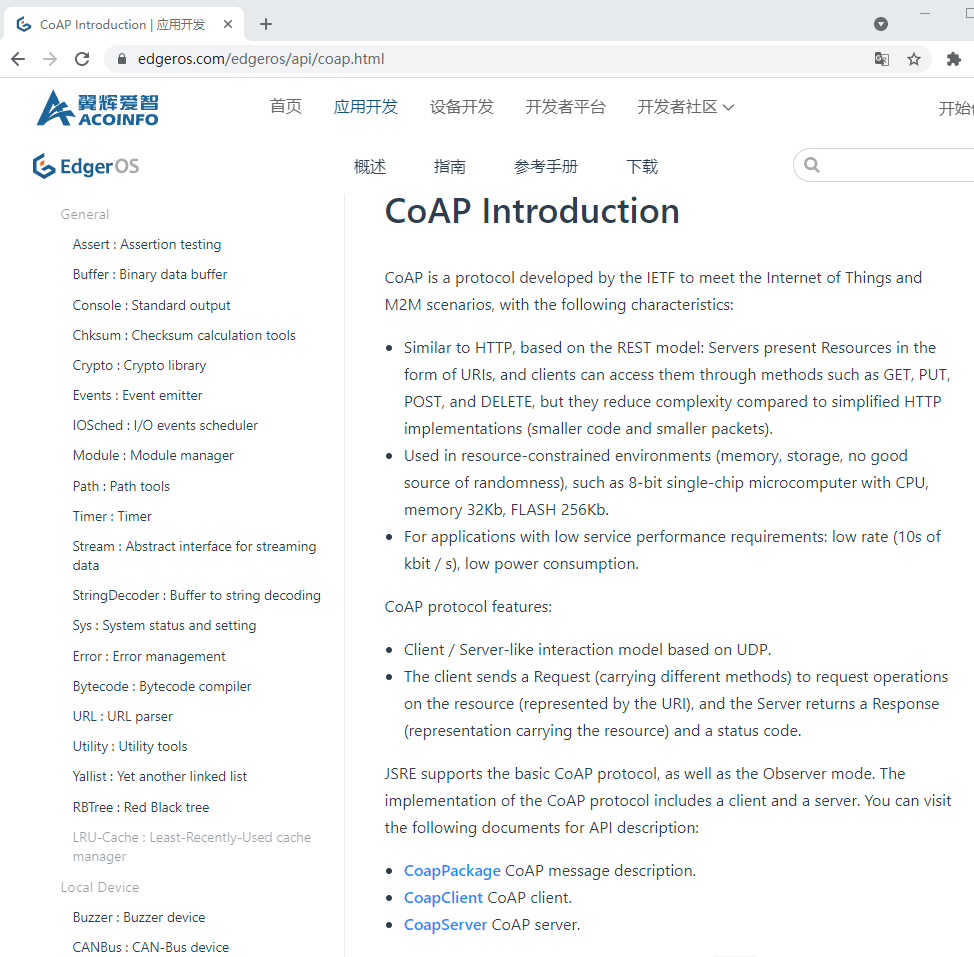 EdgerOS 实现了一个 CoAP 模块,EdgerOS 应用开发者可以使用该模块实现 CoAP Server 或 Client 功能: