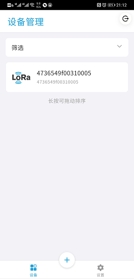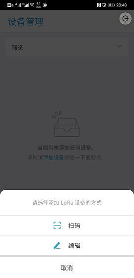 手机通过爱智 App 进入 EdgerOS 后,点击 LoRa App,进入 LoRa 设备管理界面: