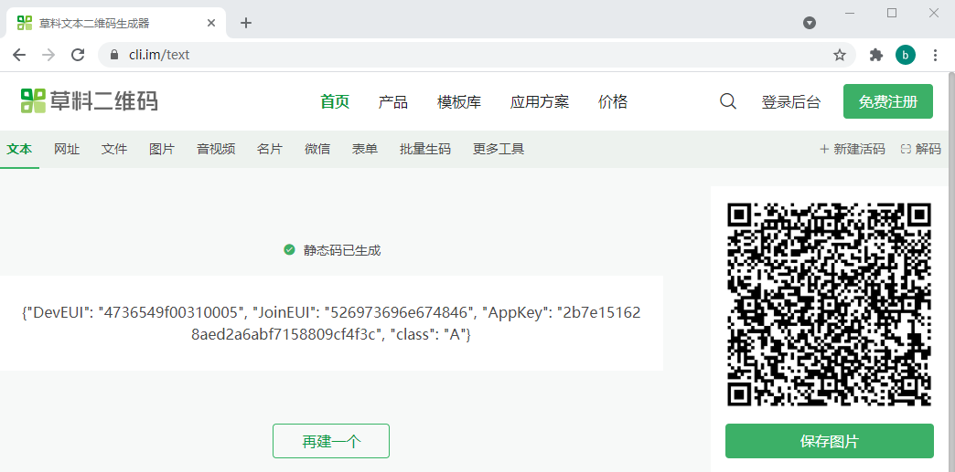 复制入网信息 JSON 字符串并粘贴到 草料二维码生成器 的文本输入框,生成二维码图片并保存。