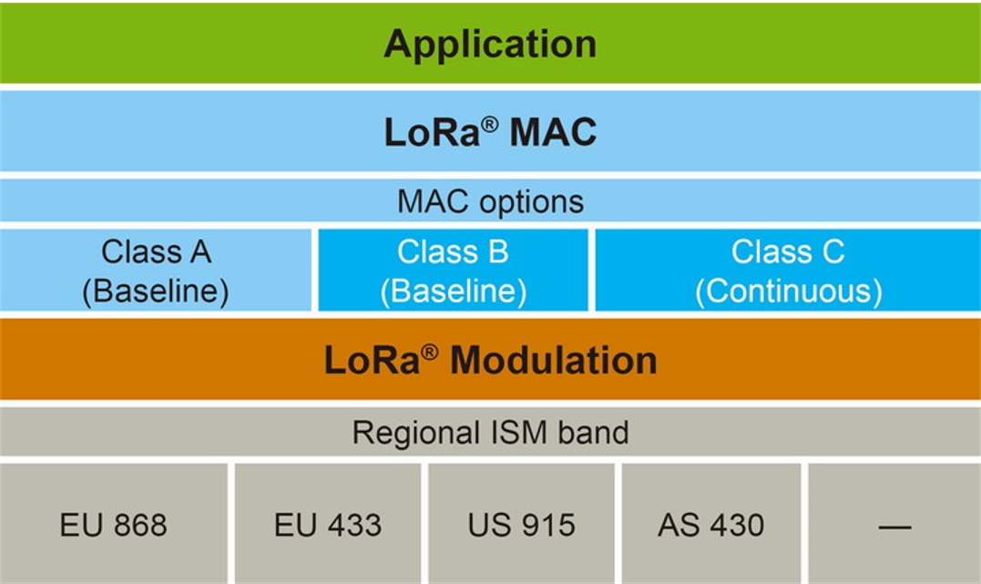 按照 LoRa 联盟官方白皮书《What is LoRaWAN》的介绍,LoRaWAN 是为 LoRa 远距离通信网络设计的一套通讯协议和系统架构,下图为 LoRaWAN 协议层次图: