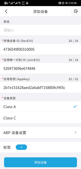 点击扫码,扫描 LoRaWAN 设备的二维码: