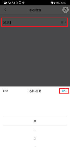点击通道 1,选择通道 1 的信道(如信道 0),点击确认完成信道选择,最后点击左上角的返回箭头返回: