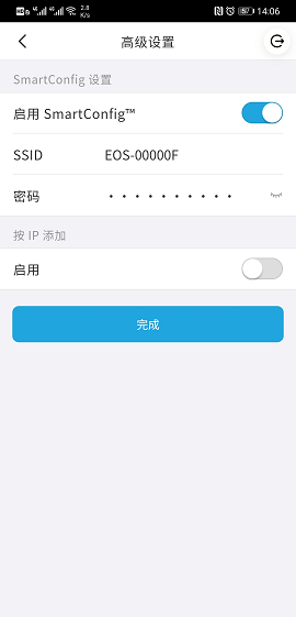 配置 Wi-Fi 物联网设备需要连接到的 Spirit 1 的 Wi-Fi AP SSID 和密码(一般保持默认,即连接到当前手机连接到的 Spirit 1),打开启用 SmartConfig 开关,最后点击完成按钮: