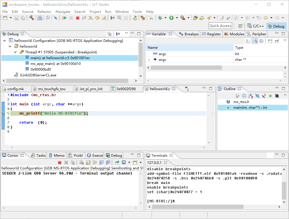 当 APP 镜像下载完毕后,会在 main 函数停下来。IoT Studio 内建的 Terminal 终端将会自动连接到 MS-RTOS 的 shell 服务,接下来就可以正式开始调试。