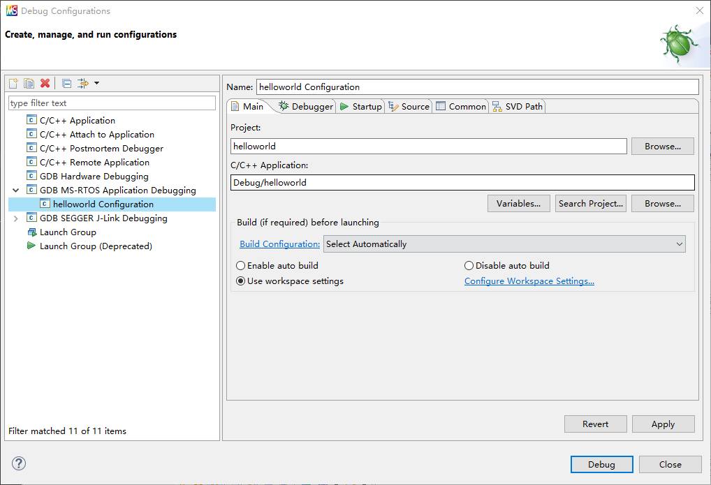- 点击 C/C++ Application 右侧的 Browse... 按钮选择需要调试的 ELF 文件,如 Debug/helloworld。