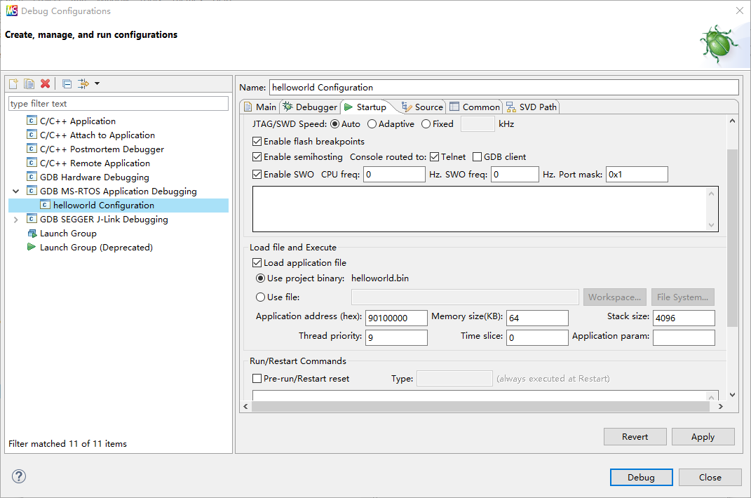 MS-RTOS 启动后,会自动运行 FLASH 0x90100000 地址处的 helloworld 应用程序。