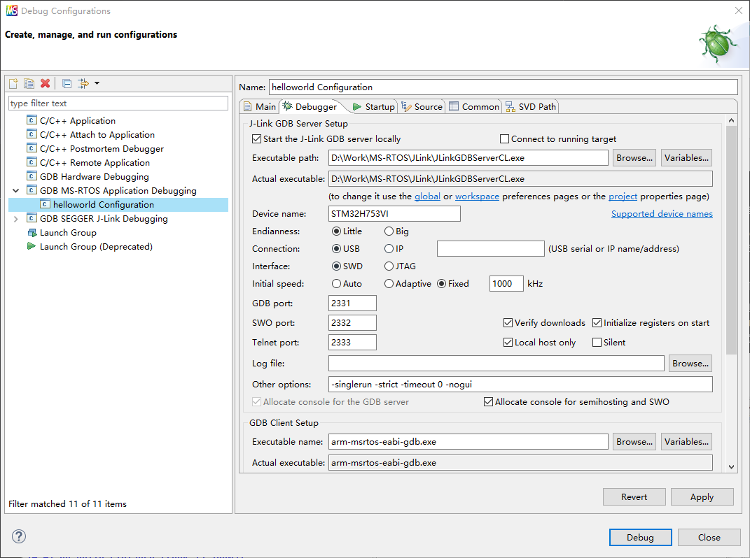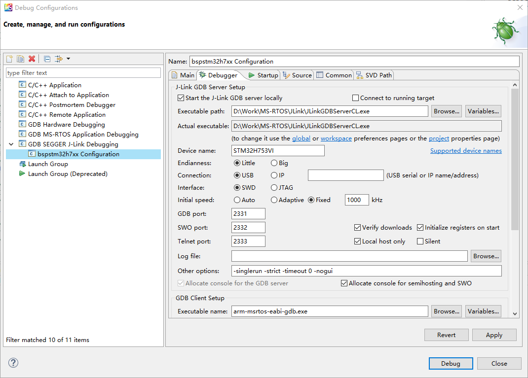 - 点击 Executable path 右侧的 Browse... 按钮选择 JLinkGDBServerCL.exe 的文件路径,如 D:\Work\MS-RTOS\JLink\JLinkGDBServerCL.exe。